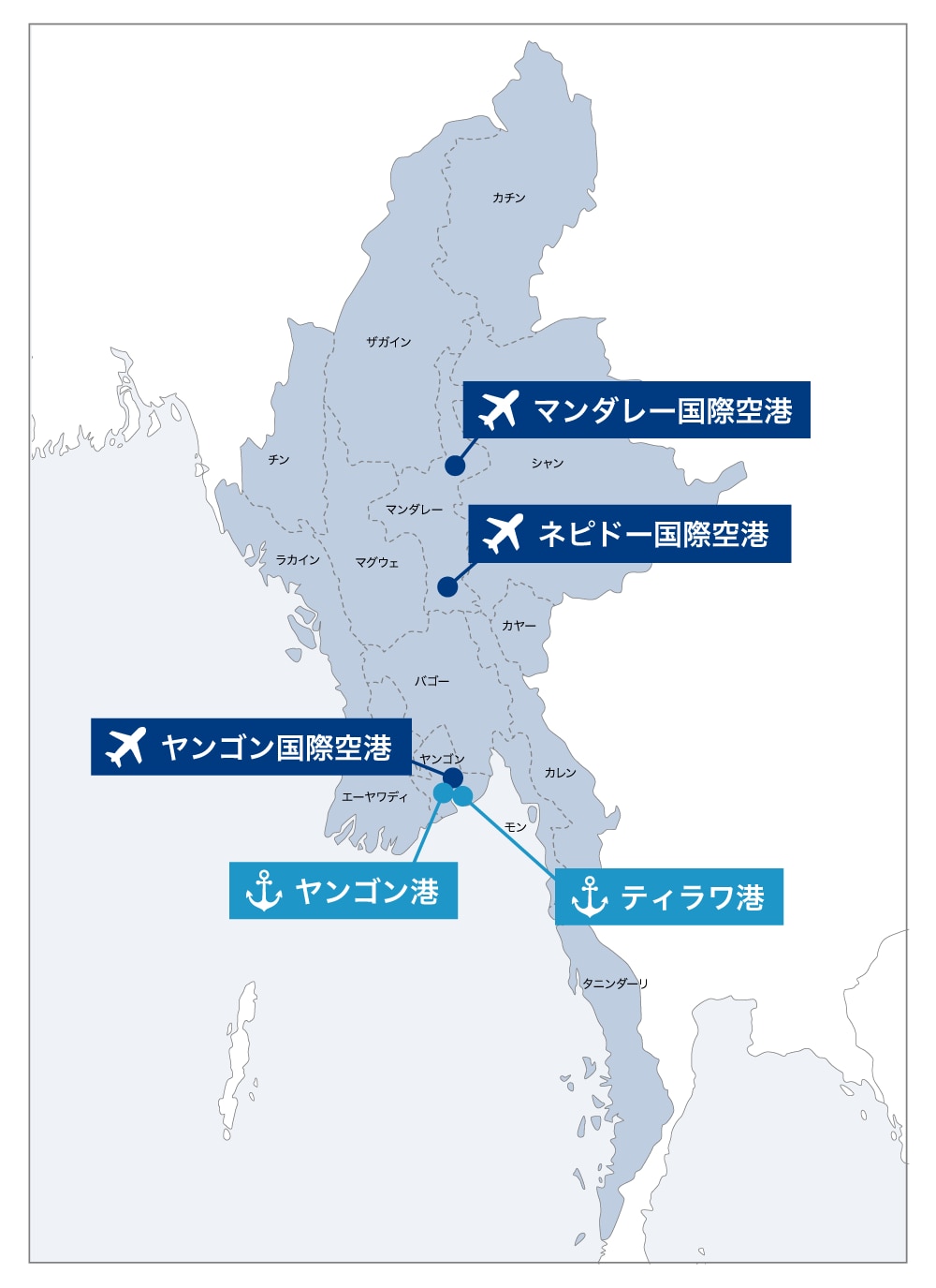 ヤンゴン港やティラワ港を主要港湾としており、海上輸送を利用する企業にとって重要な拠点となります。また、ミャンマー到着後はイラワジ川などの河川を利用した内陸輸送もあります。