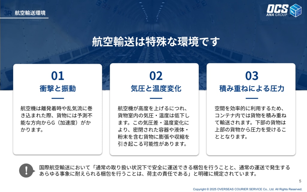 航空輸送における適切な梱包の重要性や貨物の性質に合った梱包資材についてご紹介しています。